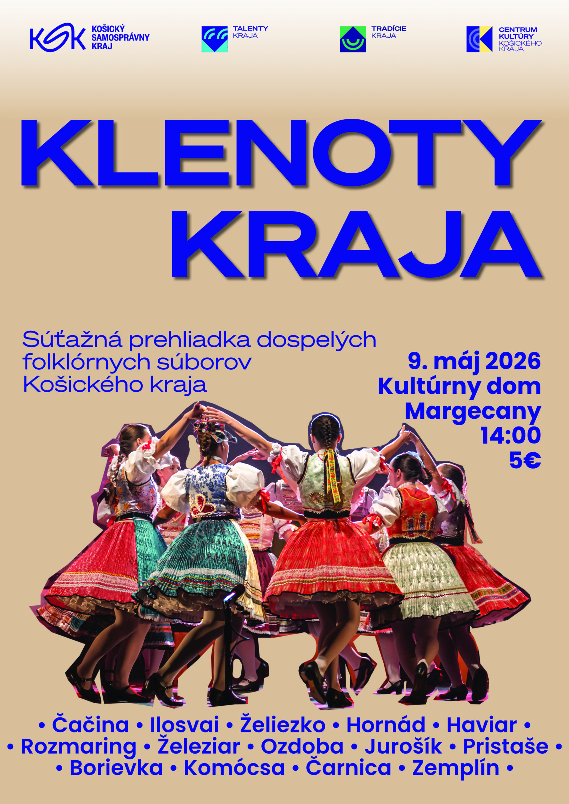 Folklór v rôznych podobách, z rôznych regiónov a spracovaný rozličnými prístupmi. V sobotu 9. mája 2026 sa v Kultúrnom dome v Margecanoch predstaví 14 folklórnych kolektívov na treťom ročníku súťažnej prehliadky folklórnych súborov Košického kraja. Klenoty kraja ponúknu pohľad na to, ako sa dnes folklór žije, vyvíja a nachádza svoje miesto na javisku aj mimo neho.