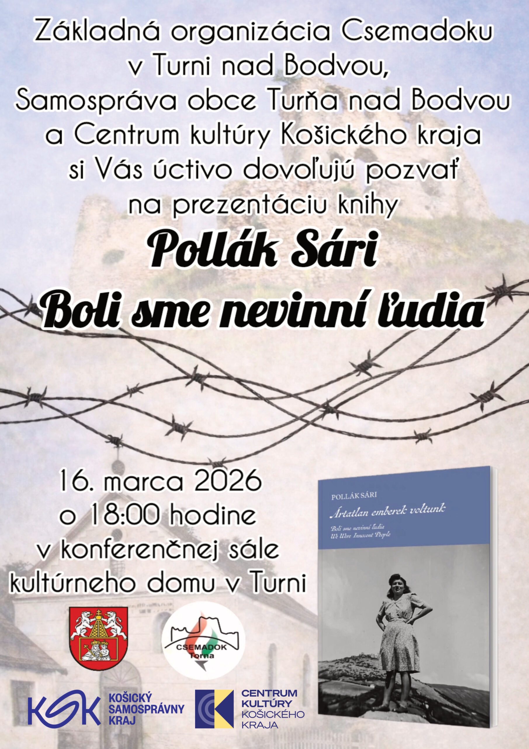 Centrum kultúry Košického kraja pozýva verejnosť na prezentáciu knihy Boli sme nevinní ľudia. Podujatie sa uskutoční 16. marca 2026 o 18.00 hod. v konferenčnej sále Kultúrneho domu v Turni nad Bodvou.