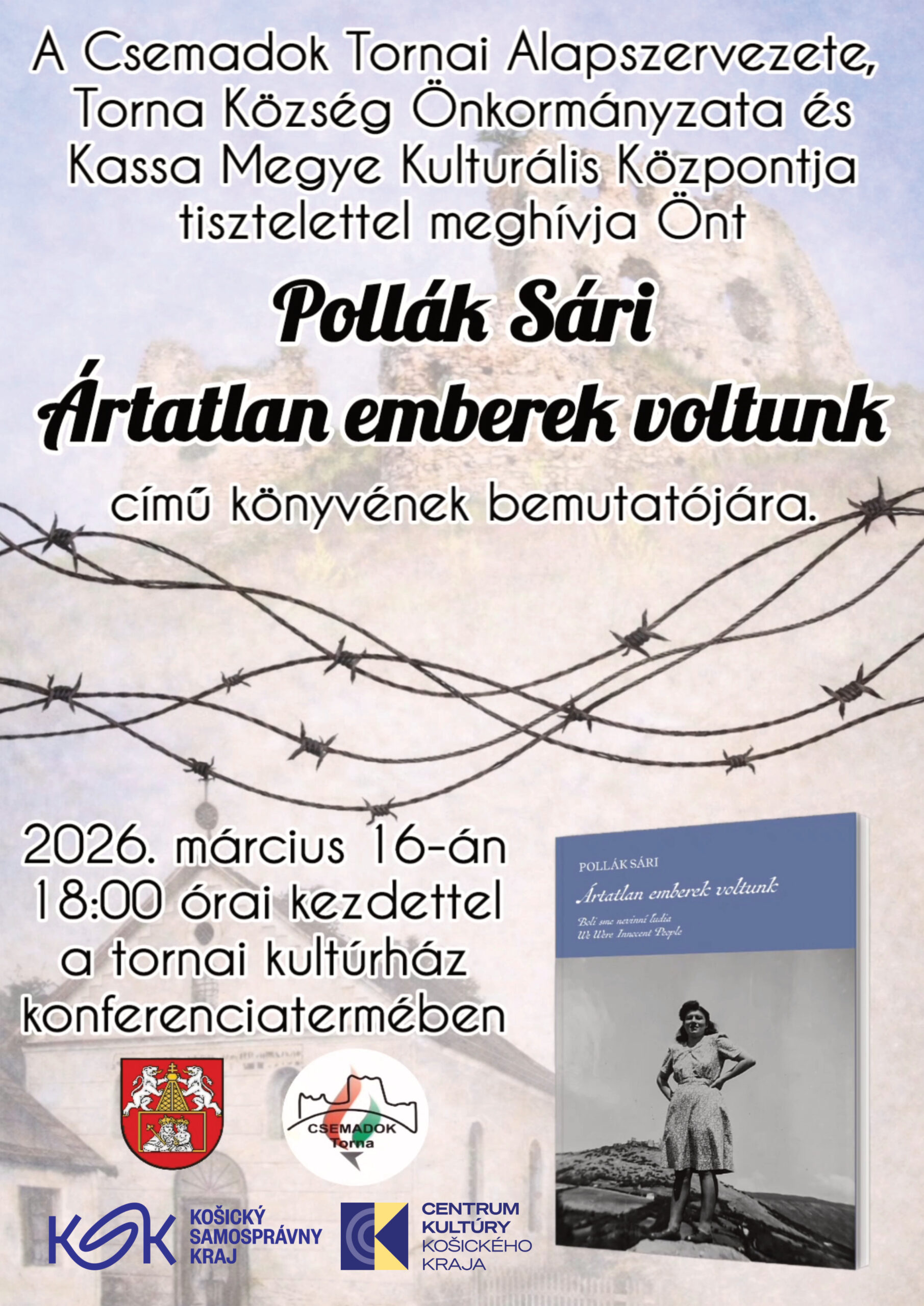 Kassa Megye Kulturális Központja szeretettel meghívja a nyilvánosságot az Ártatlan emberek voltunk című könyv bemutatójára. A rendezvényre 2026. március 16-án, 18:00 órakor kerül sor a tornai Kultúrház konferenciatermében.